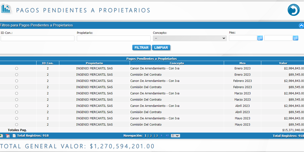 - Pagos pendientes a propietarios.