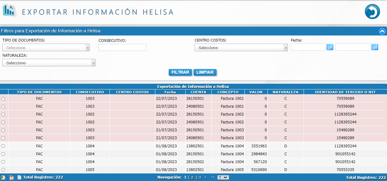 - Exportar documentos contables a Helisa.