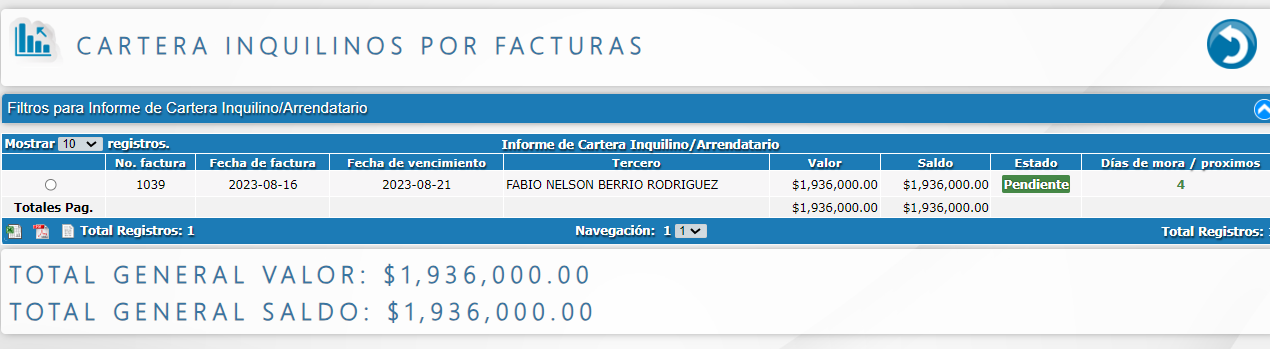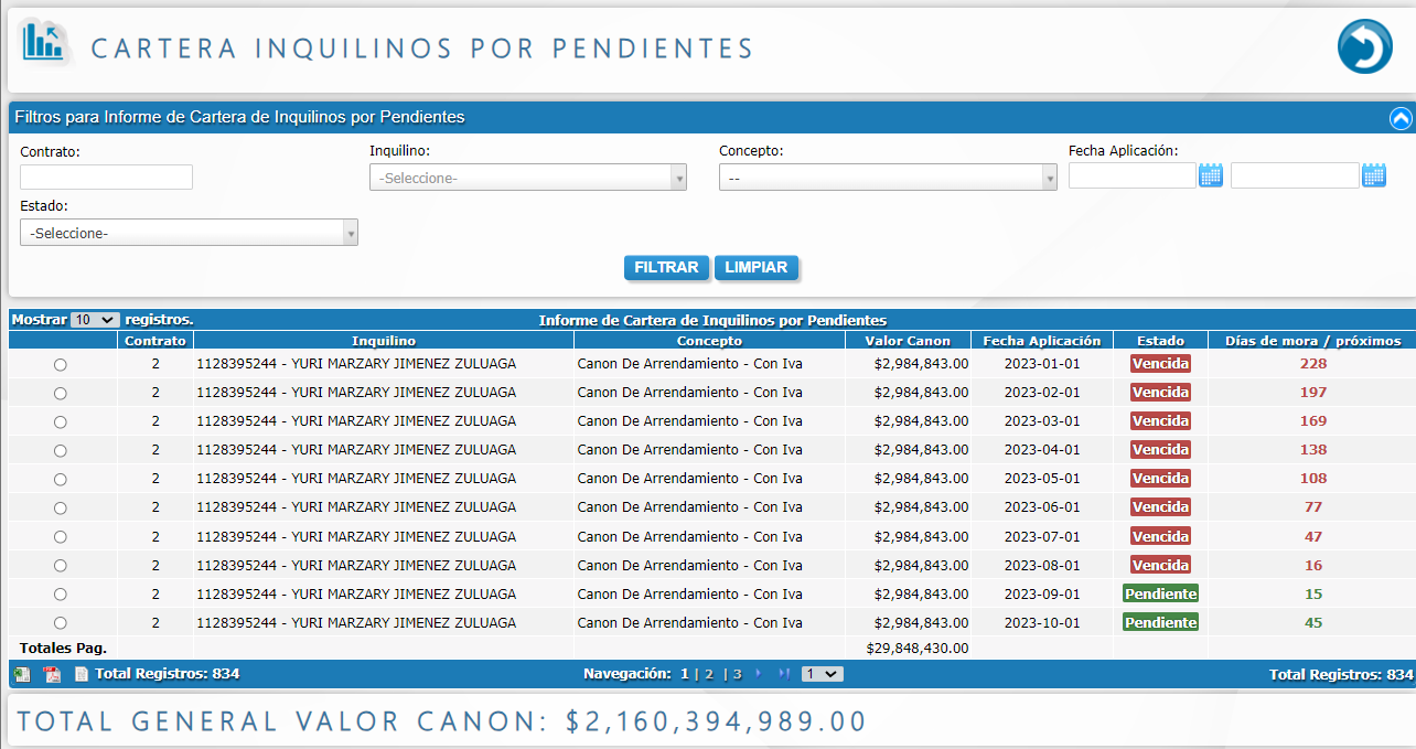 - Cartera inquilinos/arrendatarios por pendientes.