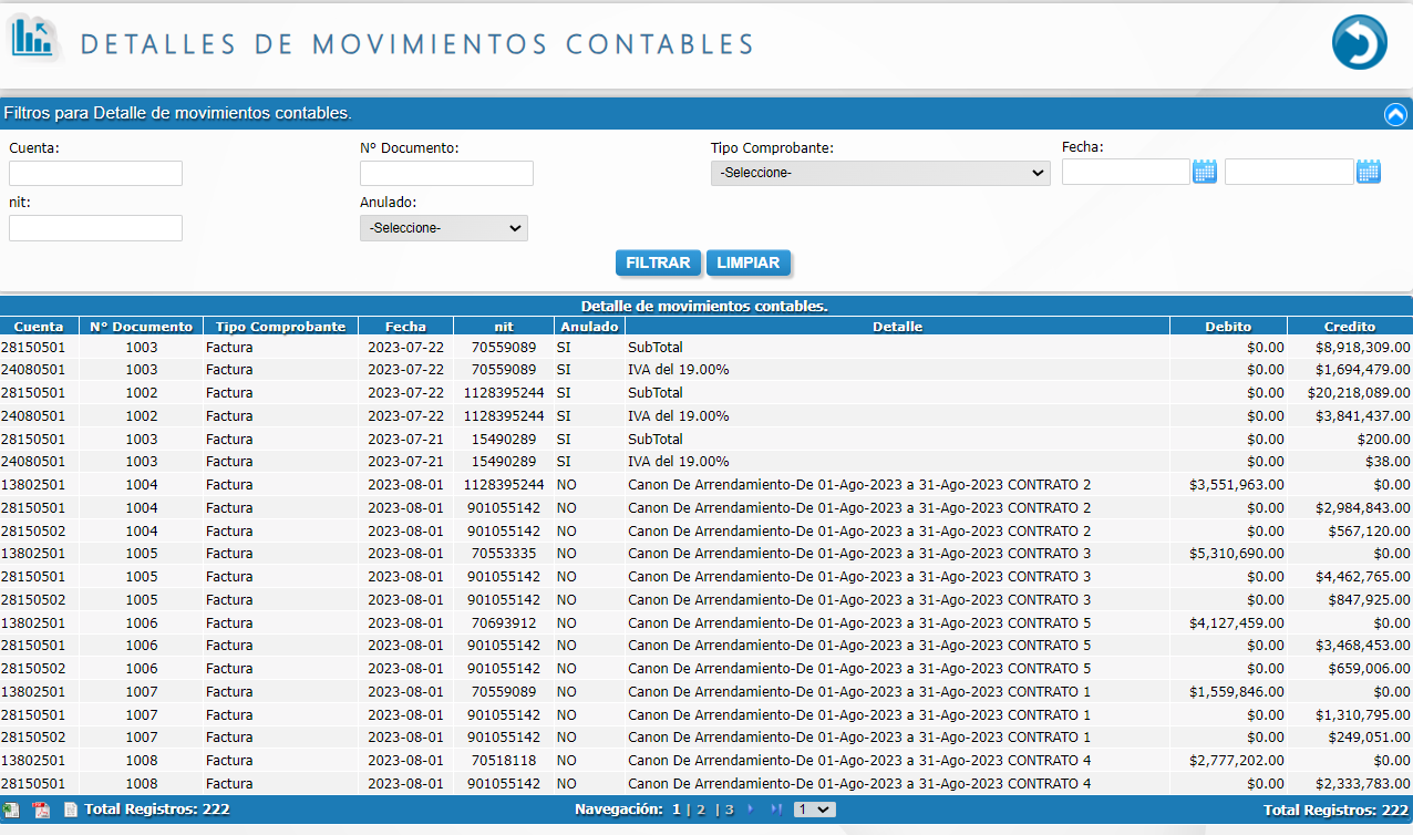 - Detalles de movimientos contables.