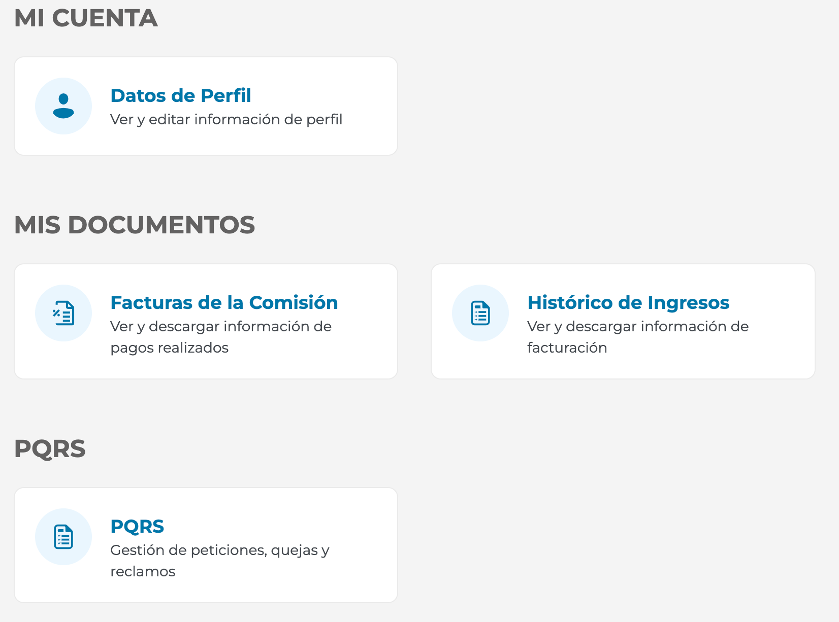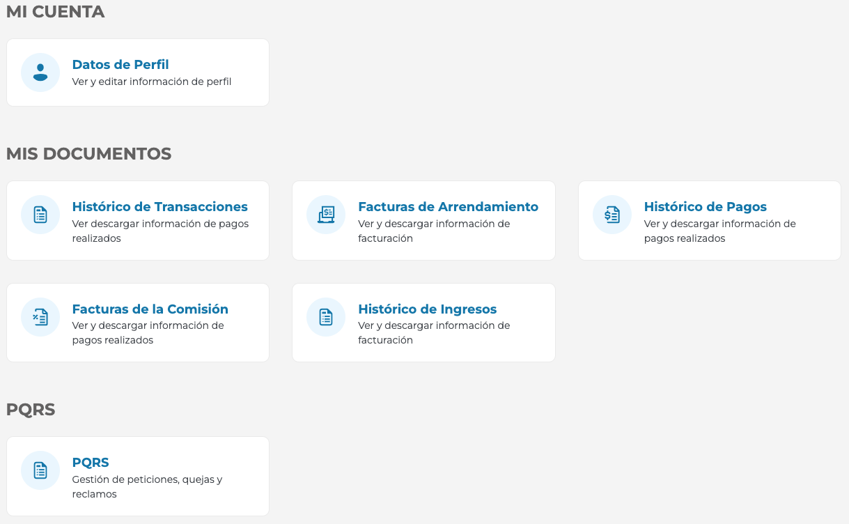 • Propietarios: Facturas de comisión, historial de ingresos.