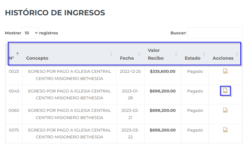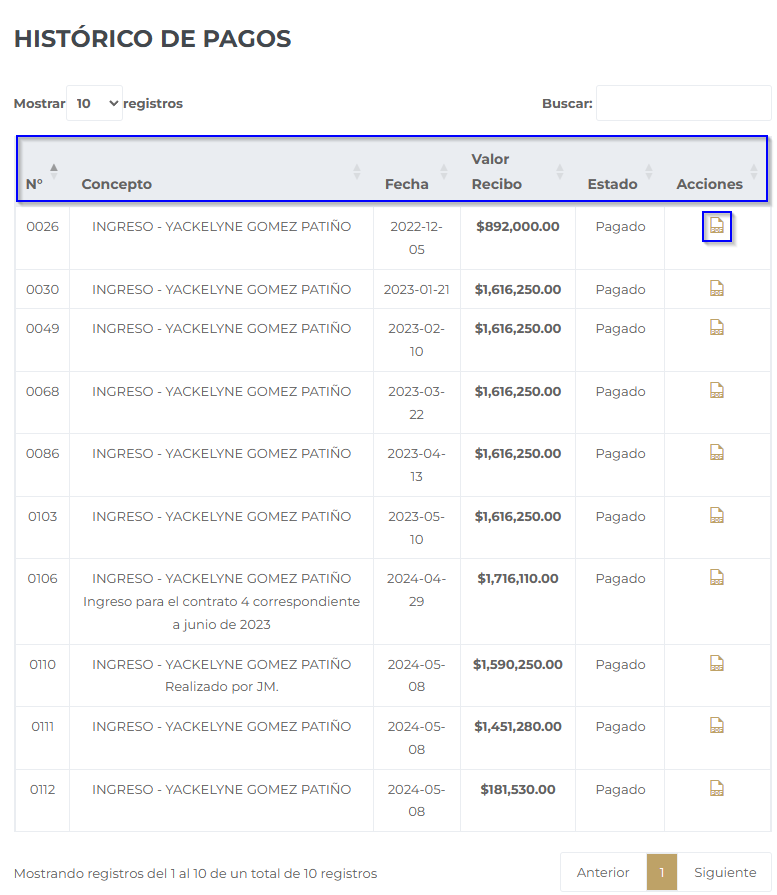 • Haga clic en el ícono "PDF" junto al pago deseado para previsualizar y descargarlo.