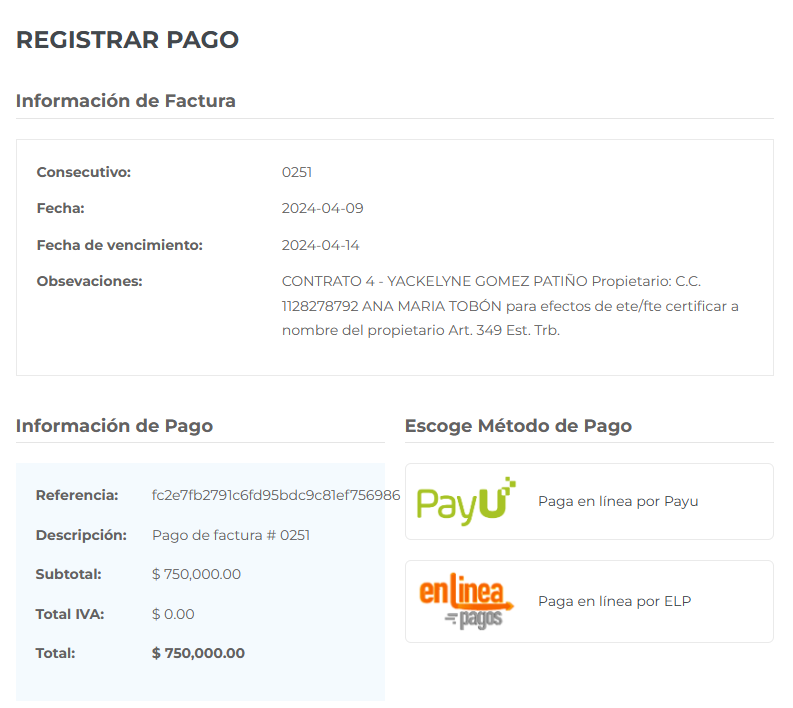 1. Se abrirá la ventana "Registrar Pago" con los datos de la factura: