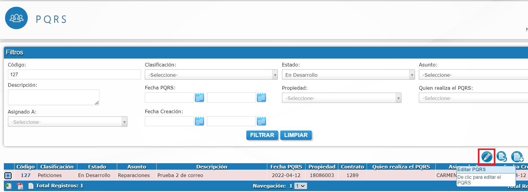 Paso 2: Utilice la sección de filtros para buscar la PQRS que necesita editar. Puede usar 1 de los campos o combinarlos entre sí para determinar la búsqueda. Seleccione el registro desde la casilla circular al lado izquierdo y de clic en Editar.