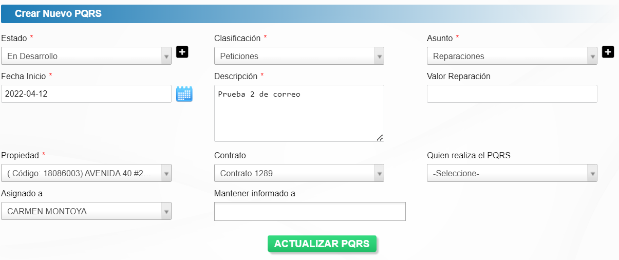 Paso 3: Se desplegará una ventana mostrando los campos en donde se puede modificar la información y dar clic en Actualizar PQRS.