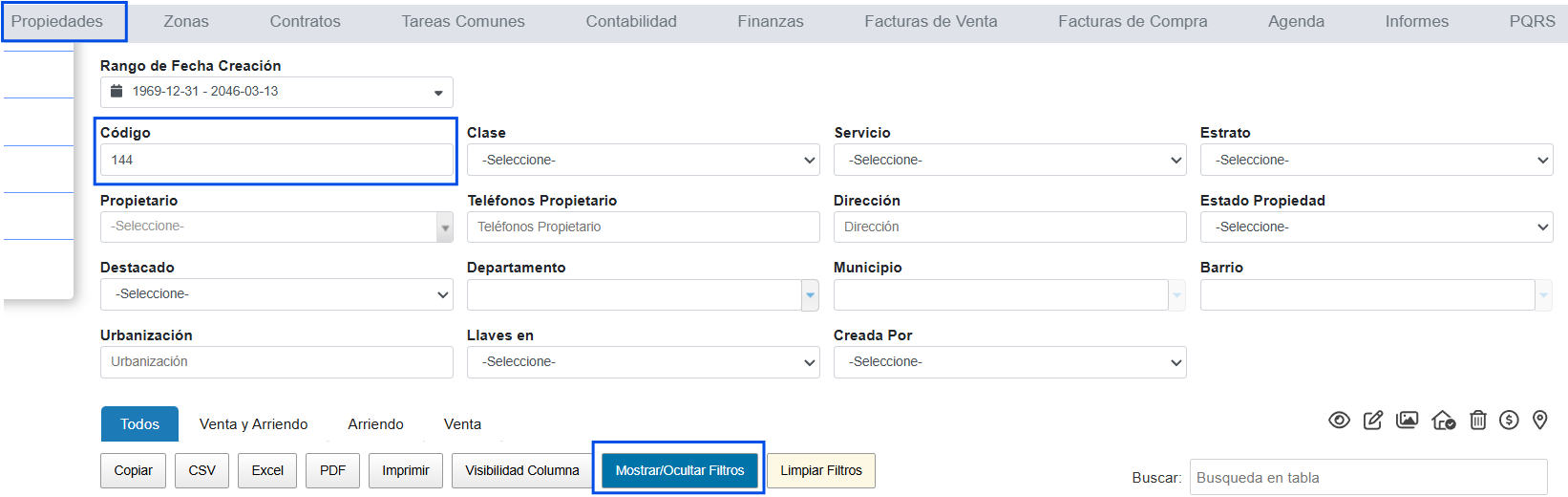 | 🔍 Buscar (Filtros) | Encontrar el inmueble rápidamente. | Escribe la dirección, el código de la propiedad o el nombre del propietario y busca. |
