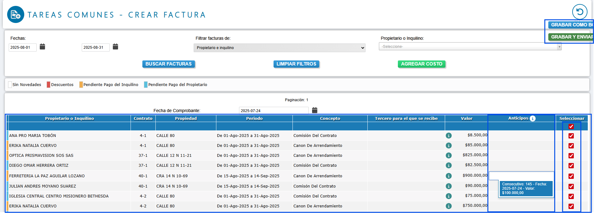El módulo de Tareas Comunes en nuby permite generar facturas de forma masiva para contratos de arrendamiento existentes. Esta guía explica cómo filtrar, revisar y emitir facturas con los datos preconfigurados en los contratos, incluyendo opciones para aplicar anticipos o agregar conceptos adicionales.