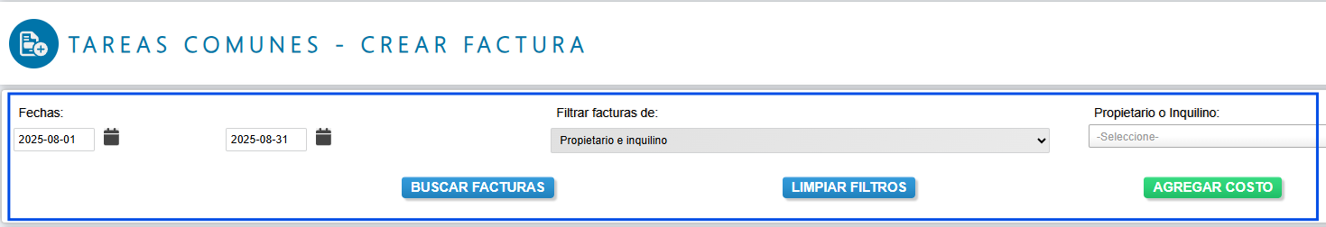Buscar/Limpiar | Haga clic en "Buscar facturas" o "Limpiar" para reiniciar filtros. | — |