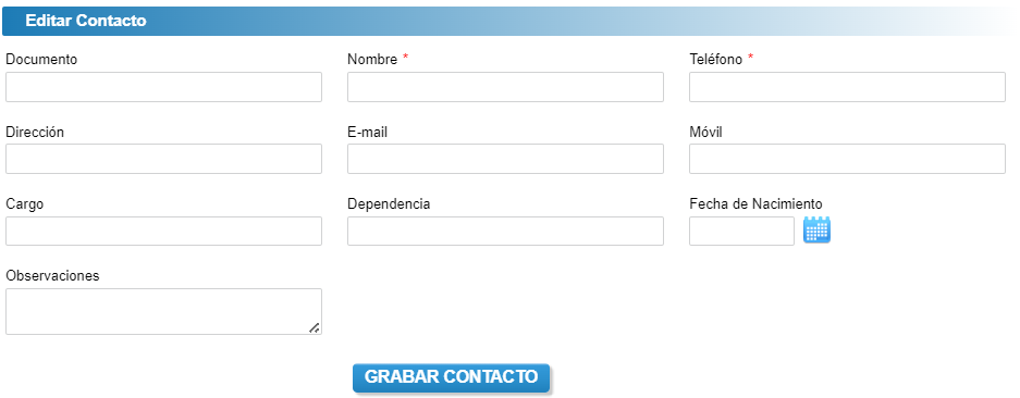 - De clic en el boton Agregar Contacto, luego el sistema mostrará una ventana con varios campos para ingresar la información de: Documento, Nombre, Teléfono, Dirección, Email, Movil, Cargo, Dependencia, Fecha de nacimiento, Observaciones.
