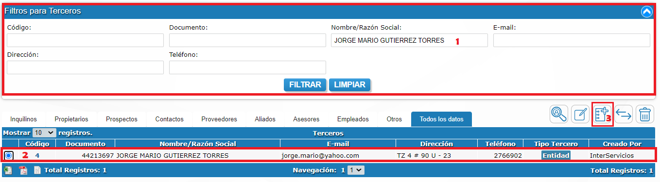 Paso 2: Se debe filtrar por el tercero al que se requiere modificar la información.