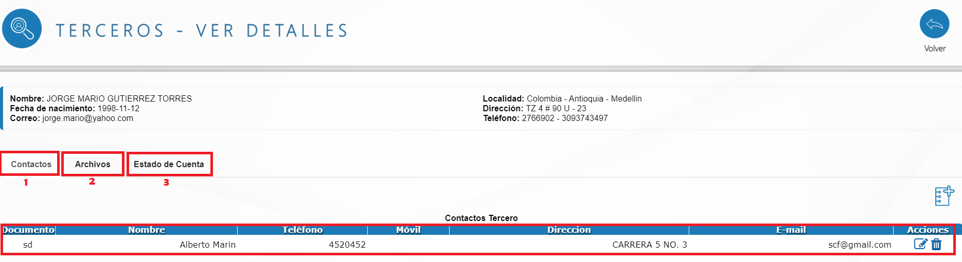 - Contactos: En esta sección puede agregar contactos del tercero dando clic en el botón agregar.