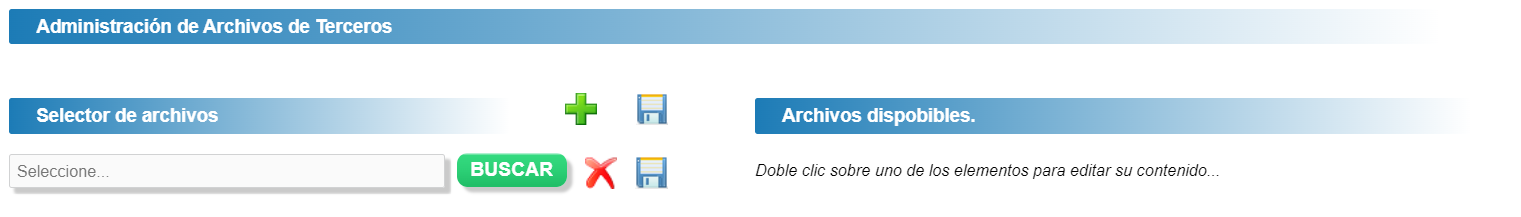 - Archivos: En esta sección podrá agregar archivos relacionados con el tercero dando clic en el botón Administrar y abrirá una ventana para guardar archivos. Presione el botón buscar, seleccione el archivo que desea adjuntar y de clic en abrir; luego de clic en el icono cargar archivo.