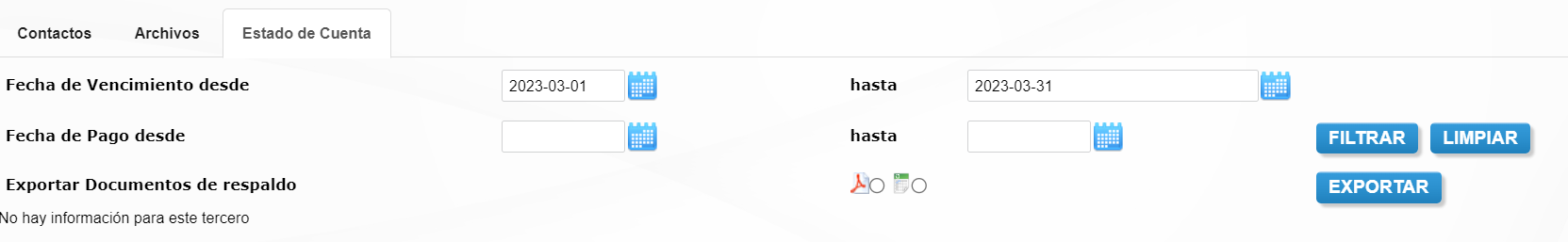 - Estado de cuenta: En esta función se podrá revisar el estado de cuenta ingresando las fechas en las que se requiere la información y dando clic en el botón filtrar y exportar información. Realice la consulta ya sea por el rango de fecha de vencimiento o por fecha de pago, luego de clic en el botón filtrar; Para exportar la información seleccione el tipo de documento (pdf o Excel) y de clic en el botón exportar.