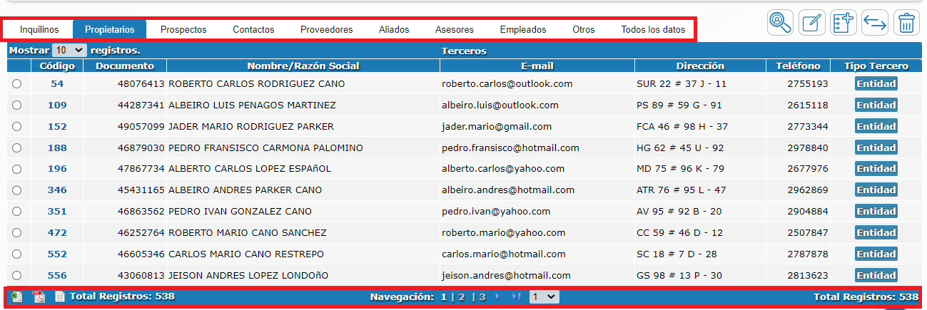 Paso 3: En la tabla de registros podrá encontrar varias opciones como consultar registros por el tipo de Tercero, ya sea propietario, inquilino, contactos, proveedores, aliados etc.., y también exportar la lista de registros en formato pdf, excel o archivo plano.