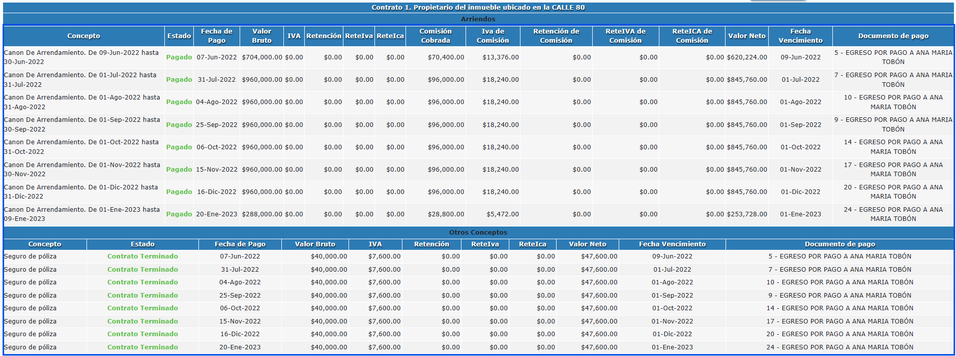 Documento de pago: Si la factura ya fue cancelada, aquí verás el número del recibo de caja con el que el inquilino pagó (o el egreso con el que le pagaste al propietario).