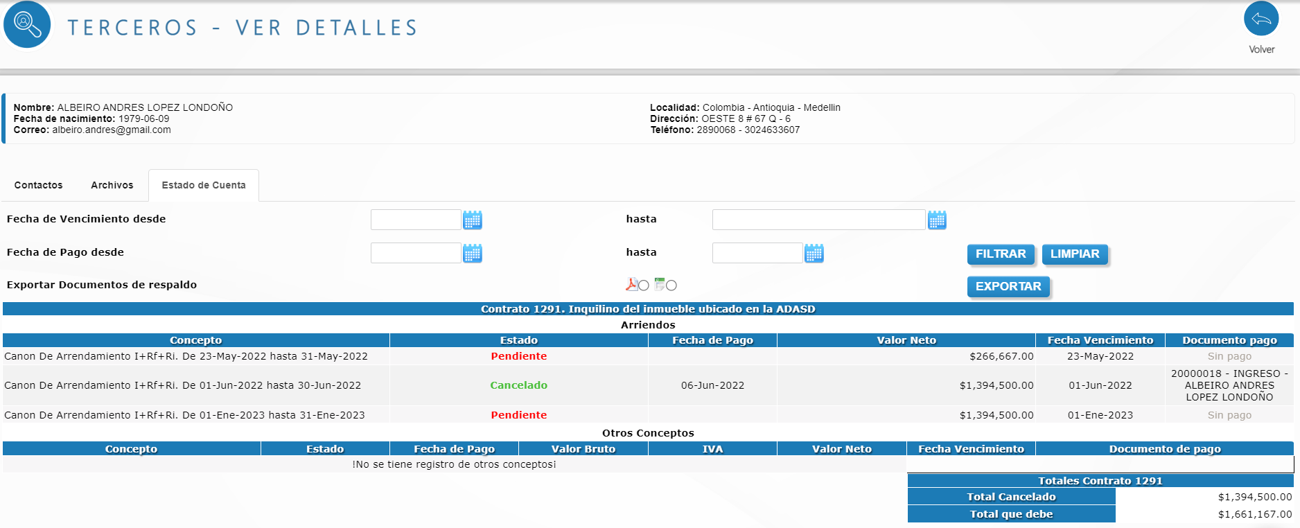 Paso 3: Aparecerá una ventana con varias pestañas, Contactos, Archivos, Estado de cuenta y Certificados de Ingreso: En la pestaña de Estado de cuenta aparece la información de los movimientos y saldos durante el periodo de duración del contrato de ese tercero.
