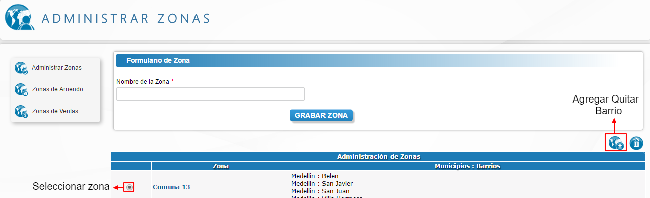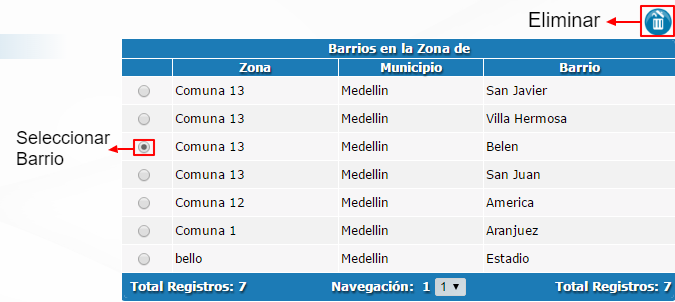 Seleccione el barrio y de clic en el icono eliminar