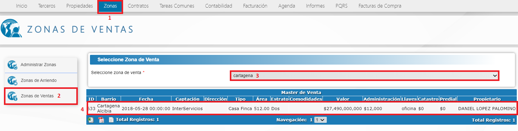 - En el campo Seleccione Zona de Ventas: De la lista desplegable debe escoger la zona que necesita consultar.